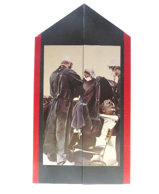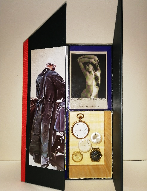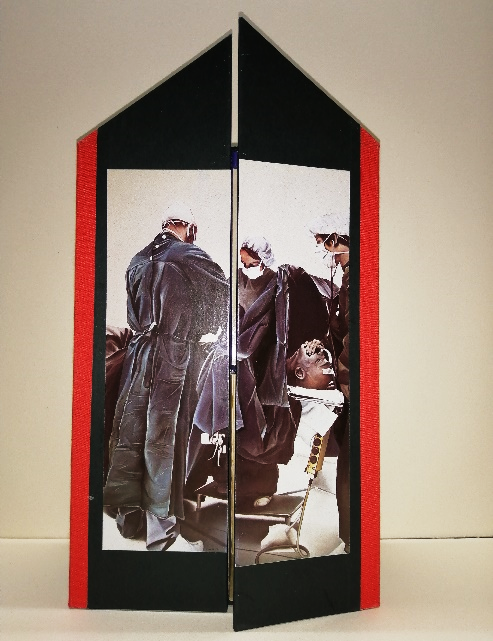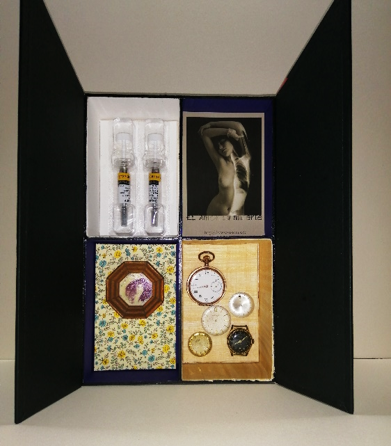 Liebe (nicht die Geburt) und Tod sind mir die Pole unseres Lebens. Unmittelbar zum Ausdruck bringt dies die Kunstpostkarte. Uhren und Ziffernblätter stehen als Symbole für Zeit und Vergänglichkeit. Im letztlich vergeblichen Kampf gegen unsere Sterblichkeit greifen wir zum medizinischen Strohhalm: operative Eingriffe (Abbildung auf den Außenseiten der Flügel) und Medikamente (Injektionsspritzen). Für die den Tod überwindende Liebe steht das Porträtfoto.