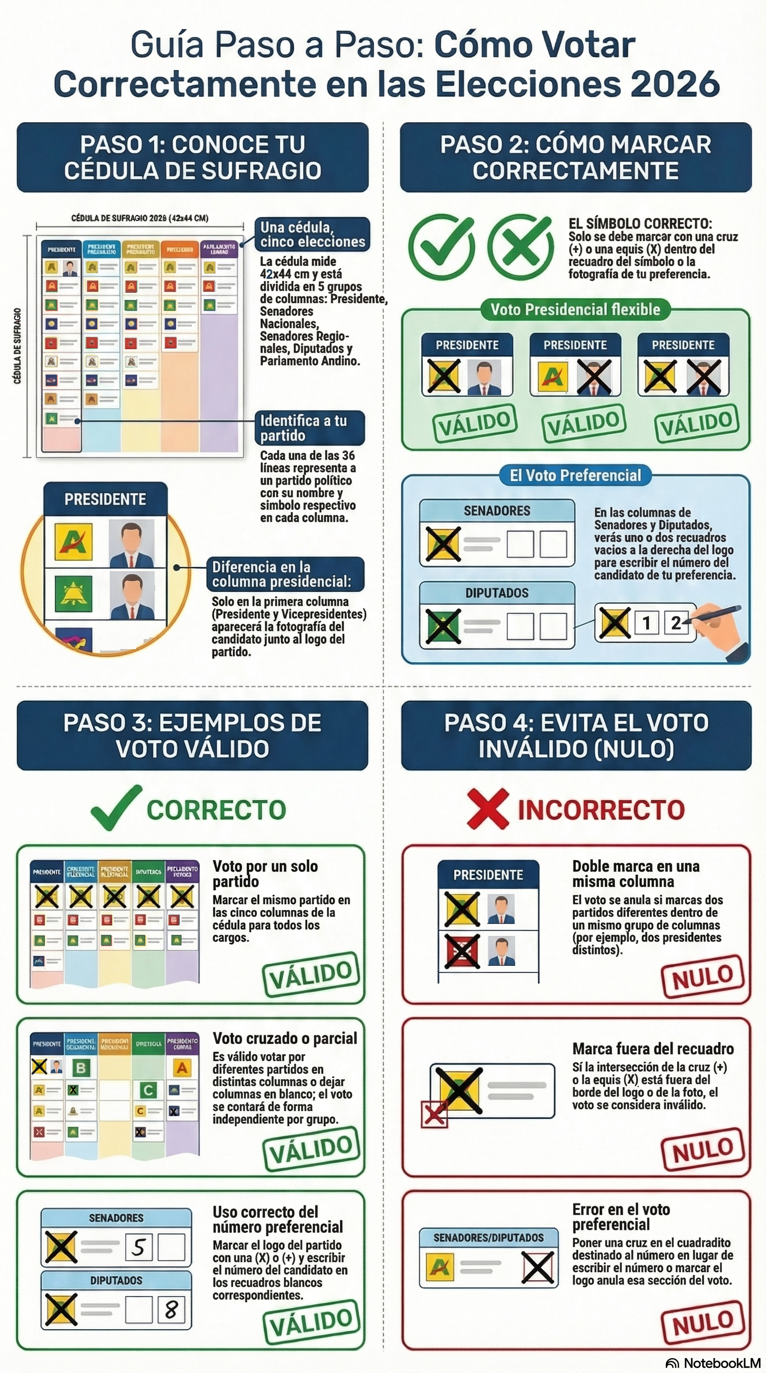 ¡Cuidado! Solo puedes elegir una línea de partido por cada grupo de columnas. Si marcas dos partidos distintos para el mismo cargo (por ejemplo, dos presidentes), ese voto será anulado.